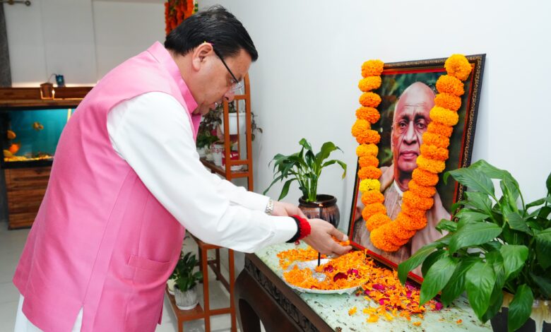 देहरादून। उत्तराखंड के मुख्यमंत्री पुष्कर सिंह धामी ने शुक्रवार को लौह पुरूष सरदार बल्लभ भाई पटेल जी की जयन्ती के अवसर पर मुख्यमंत्री आवास में उनके चित्र पर श्रद्धा सुमन अर्पित कर श्रद्धांजलि दी।