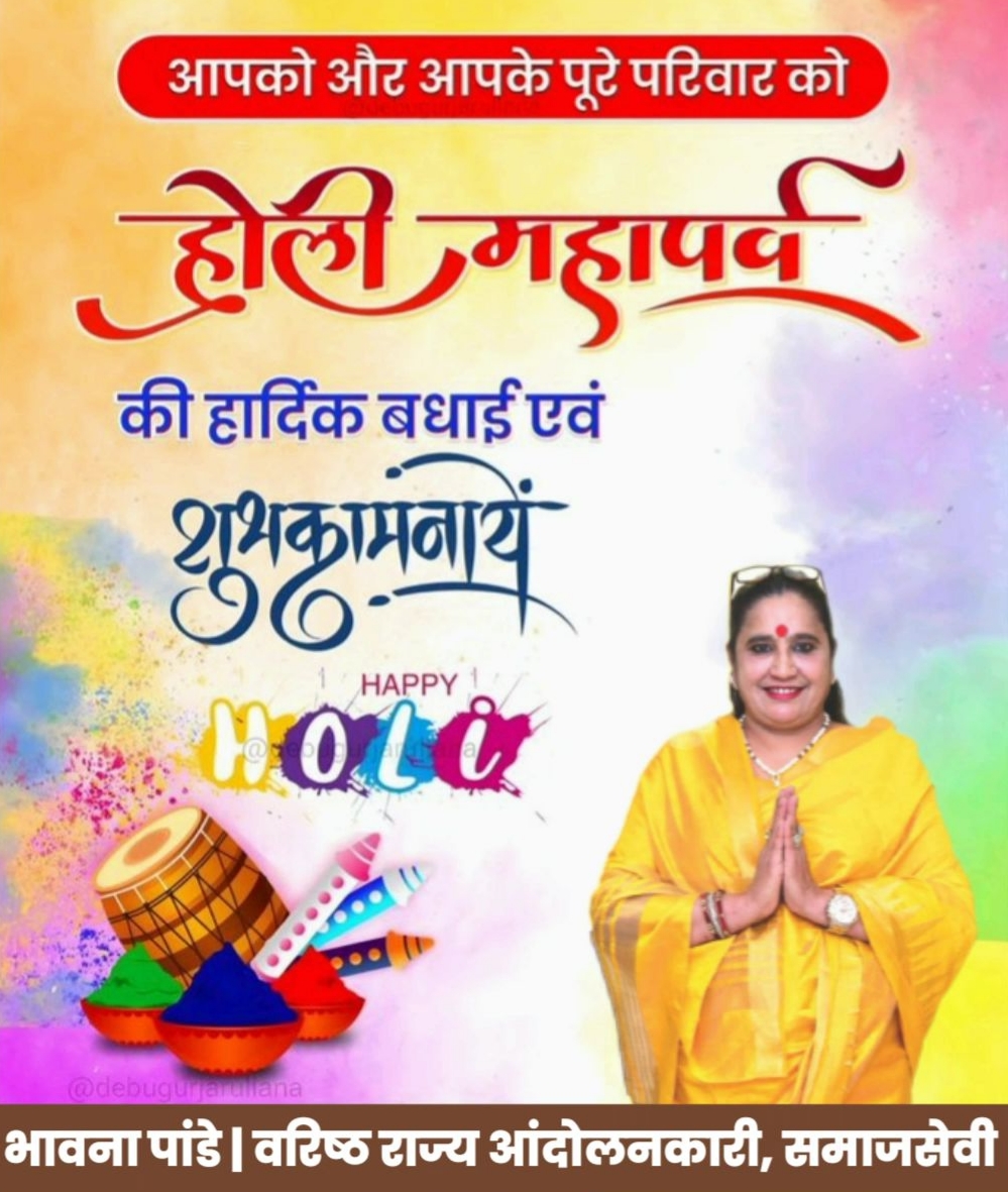 इस अवसर पर जारी अपने संदेश में उत्तराखंड की बेटी भावना पांडे ने कहा- समस्त देशवासियों को एकता, समरसता, आपसी प्रेम, स्नेह एवं भाईचारे के प्रतीक पावन पर्व होली की हार्दिक बधाई एवं शुभकामनाएं। रंगों का ये पवित्र त्योहार आप सभी के जीवन को खुशियों के रंगों से भर दे, यही कामना है।