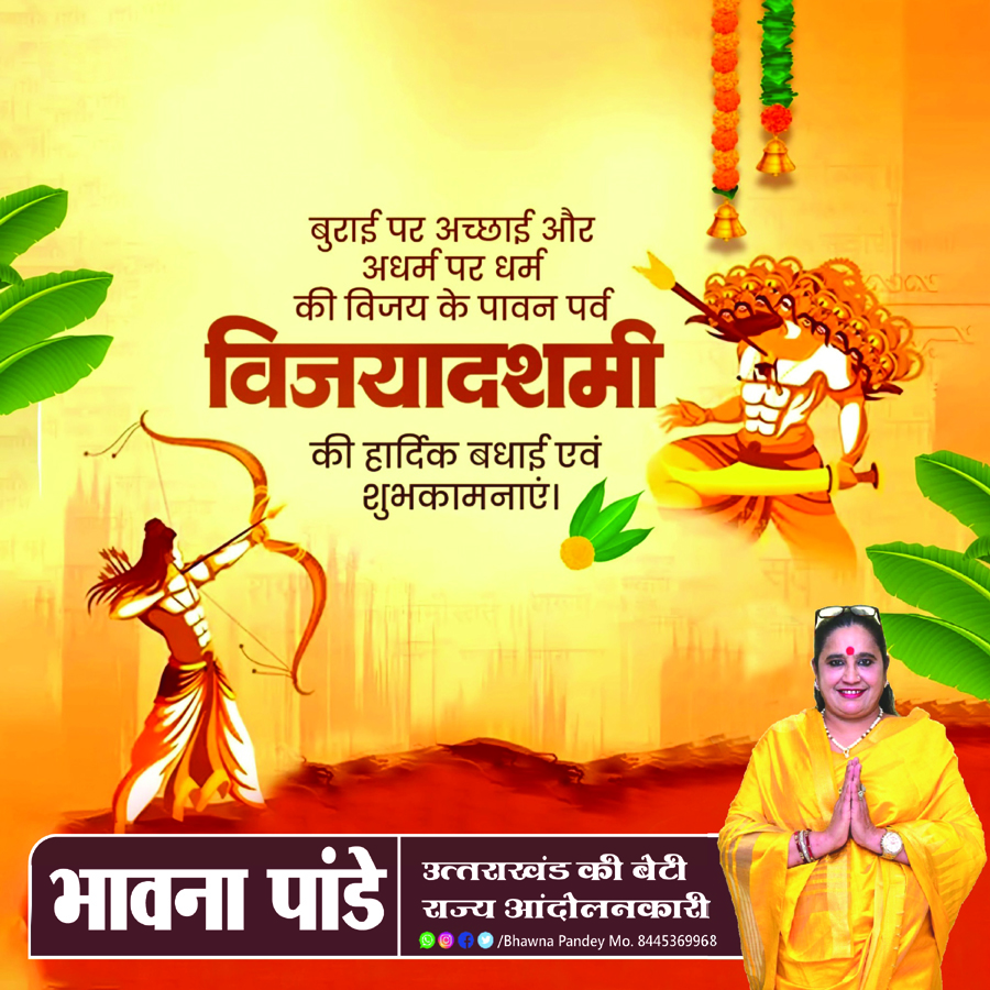 देहरादून। उत्तराखंड की बेटी, राज्य आन्दोलनकारी एवं प्रसिद्ध समाजसेवी भावना पांडे ने ‘विजयादशमी’ के पावन अवसर पर समस्त देशवासियों को हार्दिक बधाई व शुभकामनाएं दी हैं।