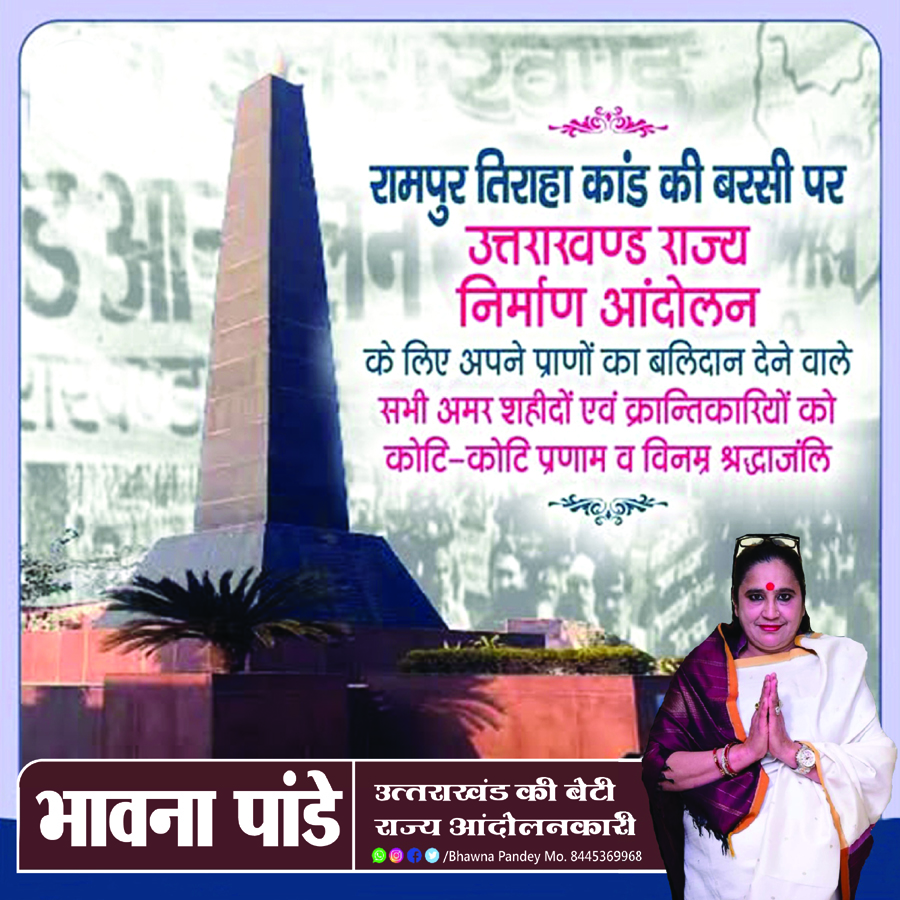 राज्य आन्दोलनकारी भावना पांडे ने रामपुर तिराहा कांड की बरसी पर राज्य निर्माण आन्दोलन के शहीदो को नमन करते हुए कहा- रामपुर तिराहा गोलीकांड में अपने प्राणों की आहुति देने वाले अमर राज्य आंदोलनकारियों को कोटि-कोटि नमन। आपके अदम्य साहस, बलिदान और संघर्ष के परिणामस्वरूप ही पृथक उत्तराखण्ड राज्य का गठन संभव हुआ।