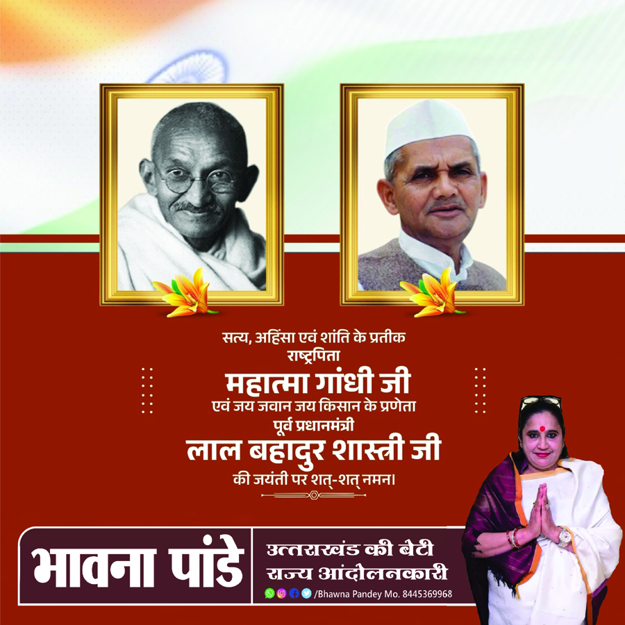 इसके साथ ही समाजसेवी भावना पांडे ने महात्मा गांधी एवं लाल बहादुर शास्त्री की जयंती पर उन्हें सादर नमन किया। भावना पांडे ने कहा- सत्य, अहिंसा और शांति के दूत राष्ट्रपिता महात्मा गांधी जी तथा “जय जवान, जय किसान” के अमर उद्घोषक, पूर्व प्रधानमंत्री श्री लाल बहादुर शास्त्री जी की जयंती पर उन्हें कोटि-कोटि नमन।