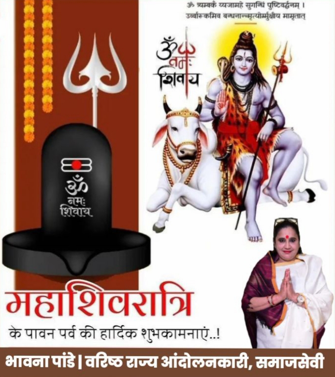इस अवसर पर जारी अपने संदेश में जनसेवी भावना पांडे ने कहा- ‘‘आप सभी को महाशिवरात्रि के पावन अवसर पर हार्दिक बधाई एवं शुभकामनाएं। भगवान भोले शंकर आपकी सभी मनोकामनाएं पूर्ण करें, यही प्रार्थना है।’’