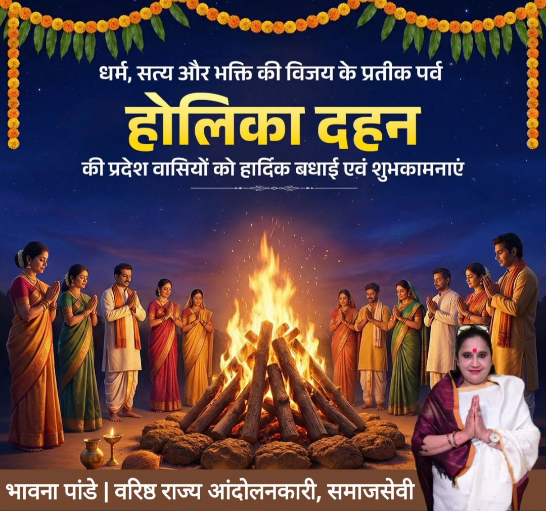 समाजसेवी भावना पांडे ने कहा- असत्य, अत्याचार, अराजकता और अहंकार पर विजय के प्रतीक होलिका दहन के इस पावन पर्व पर हम सामाजिक बुराइयों का दहन कर जीवन में सौहार्द और समरसता के भाव को आत्मसात करने का संकल्प लें।