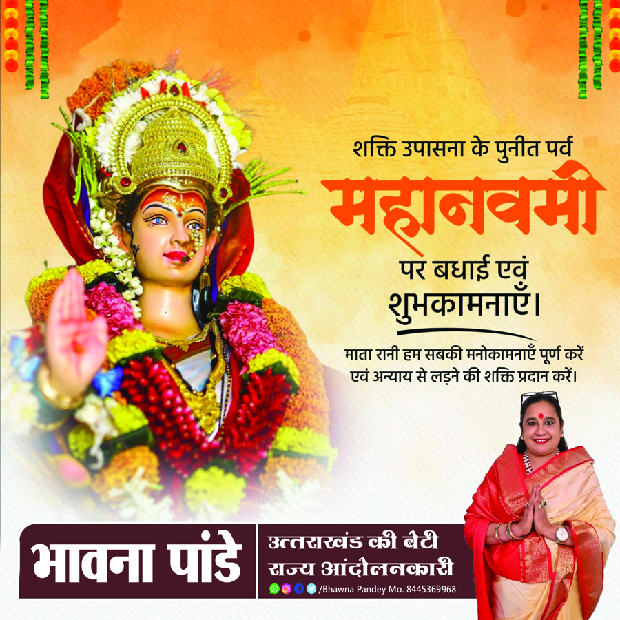 इस पावन अवसर पर अपने संदेश में उत्तराखंड की बेटी भावना पांडे ने कहा- ‘महानवमी’ के पावन अवसर पर समस्त देश वासियों, भक्तों और श्रद्धालुओं के लिए अनंत मंगलकामनाएं! माँ सिद्धिदात्री जी आप सभी भक्तों को उत्तम स्वास्थ्य व धन वैभव से परिपूर्ण करें। यही कामना है।