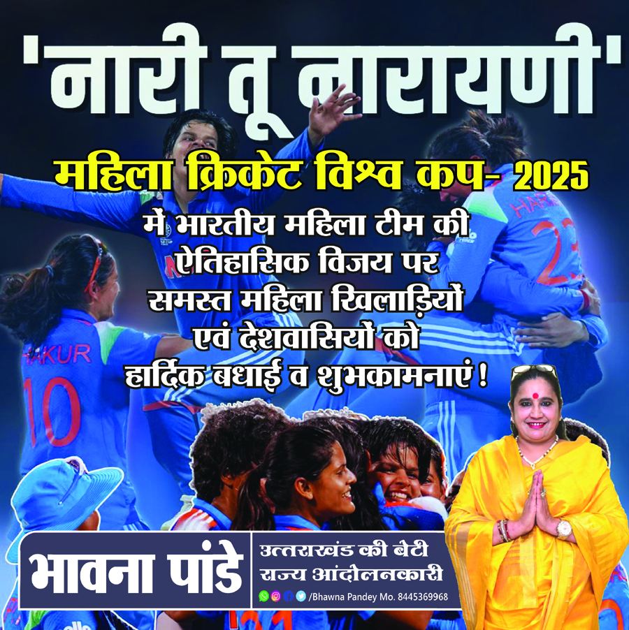 राज्य आंदोलनकारी भावना पांडे ने कहा- महिला क्रिकेट विश्व कप- 2025 में भारतीय महिला क्रिकेट टीम ने अपनी प्रतिभा और टीम भावना से नया इतिहास रच दिया है। इस विजय ने पूरे विश्व में नारी शक्ति के साथ भारत का मान बढ़ाया है। विश्व विजेता भारतीय महिला क्रिकेट टीम का हार्दिक अभिनंदन! देश वासियों को हृदयतल से बधाई। भारतीय महिला क्रिकेट टीम की ऐतिहासिक विजय पर देश को गर्व है।