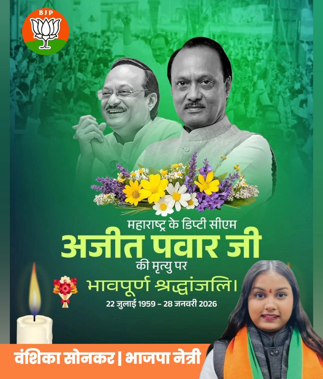 पार्षद वंशिका सोनकर ने अपने शोक संदेश में कहा- महाराष्ट्र के उपमुख्यमंत्री श्री अजित पवार जी के आकस्मिक निधन पर उन्हें भावपूर्ण श्रद्धांजलि। ईश्वर उनकी पुण्यात्मा को शांति प्रदान करें।