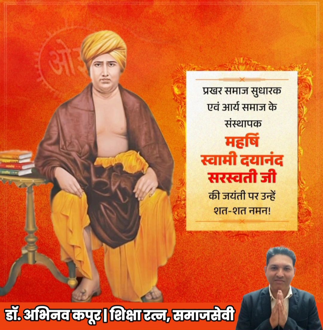 देहरादून। प्रसिद्ध जनसेवी, विख्यात शिक्षक, ज्ञान कलश सोशल वेलफेयर एंड एजुकेशनल सोसाइटी के अध्यक्ष एवं शिक्षा रत्न की उपाधि से सम्मानित डॉ. अभिनव कपूर ने महान समाज सुधारक स्वामी दयानंद सरस्वती की जयंती पर उन्हें श्रद्धासुमन अर्पित करते हुए सादर नमन किया।