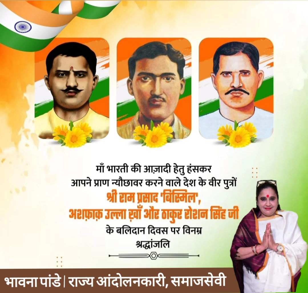 जनसेवी भावना पांडे ने कहा- भारत के स्वाभिमान की अमर गूंज ‘काकोरी ट्रेन एक्शन’ के नायक पं. राम प्रसाद बिस्मिल, अशफाक उल्ला खां व ठाकुर रोशन सिंह के बलिदान दिवस पर आज सारा देश उन्हें याद कर श्रद्धांजलि दे रहा है। मातृभूमि के सम्मान और स्वतंत्रता की लौ को प्रज्वलित रखने हेतु महान क्रांतिकारियों ने अपना सर्वस्व अर्पित कर दिया। आपकी विरासत हमें राष्ट्रहित को सर्वोपरि रखने का संकल्प देती रहेगी।
