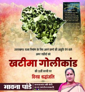 खटीमा गोलीकांड की 31वीं बरसी पर अपने भाव व्यक्त करते हुए राज्य आंदोलनकारी भावना पांडे ने कहा, “उत्तराखण्ड राज्य नवनिर्माण के लिए अपना सर्वस्व न्योछावर करने वाले अमर शहीदों एवं आंदोलनकारियों को शत शत नमन।”