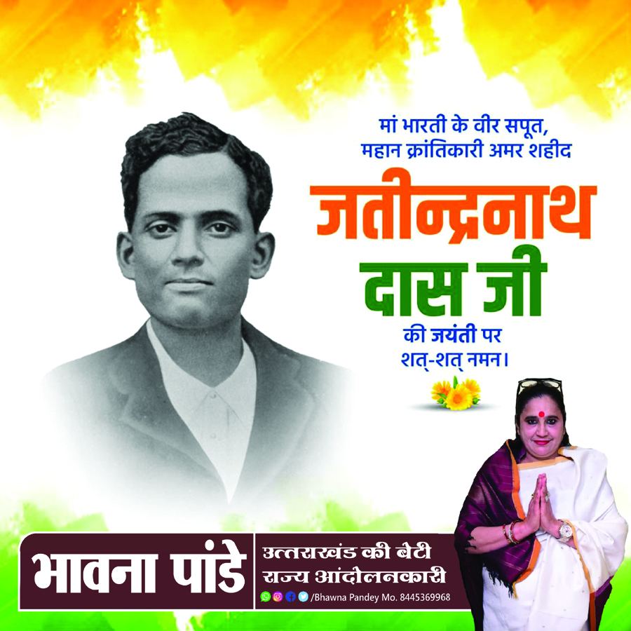 इस अवसर पर जारी अपने संदेश में उत्तराखंड की बेटी भावना पांडे ने कहा- मां भारती के वीर सपूत, महान क्रांतिकारी अमर शहीद जतीन्द्रनाथ दास जी की जयंती पर उन्हें शत्-शत् नमन। जतीन्द्रनाथ दास जी का त्याग और बलिदान सदैव हमें मातृभूमि की सेवा और राष्ट्रभक्ति की प्रेरणा देता रहेगा।