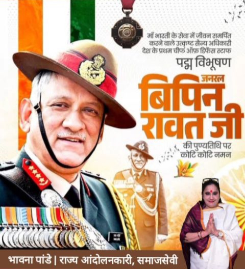 इस अवसर पर जारी अपने संदेश में जनसेवी भावना पांडे ने कहा- देश के प्रथम रक्षा प्रमुख, देवभूमि उत्तराखंड के वीर सपूत जनरल स्व. बिपिन रावत जी की पुण्यतिथि पर उन्हें विनम्र श्रद्धांजलि एवं शत्-शत् नमन। सीडीएस जनरल बिपिन रावत ने चार दशकों तक मातृभूमि की रक्षा के लिए निस्वार्थ सेवा की, वे देश का गौरव थे। असाधारण वीरता तथा साहस के लिए उन्हें सदैव याद किया जाएगा।