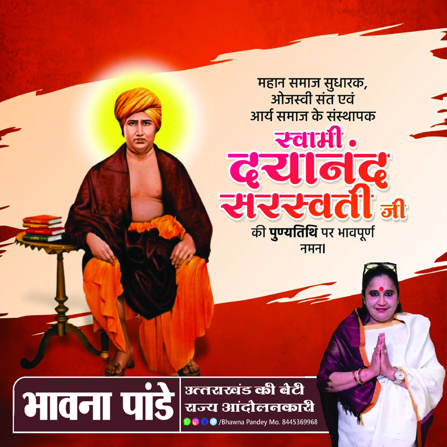 देहरादून। उत्तराखंड की बेटी, प्रसिद्ध समाजसेवी एवं राज्य आंदोलनकारी भावना पांडे ने महान समाज सुधारक स्वामी दयानंद सरस्वती की पुण्यतिथि पर उन्हें विनम्र श्रद्धांजलि अर्पित करते हुए सादर नमन किया।