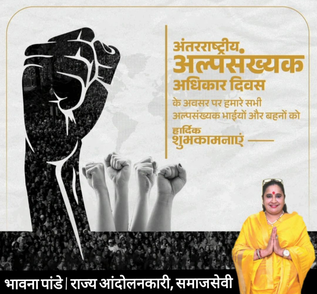 इस अवसर पर जारी अपने संदेश में उत्तराखंड की बेटी भावना पांडे ने कहा- “अंतरराष्ट्रीय अल्पसंख्यक अधिकार दिवस” के अवसर पर हमारे सभी अल्पसंख्यक भाईयों और बहनों को हार्दिक बधाई एवं शुभकामनाएं।