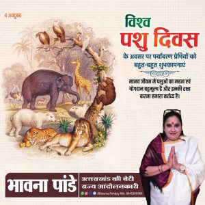 देहरादून। उत्तराखंड की बेटी, राज्य आंदोलनकारी एवं प्रसिद्ध समाजसेवी भावना पांडे ने ‘विश्व पशु दिवस’ के अवसर पर समस्त देशवासियों और पशु प्रेमियों को हार्दिक बधाई व शुभकामनाएं देने के साथ ही जागरूकता हेतु विशेष सन्देश दिया हैं।