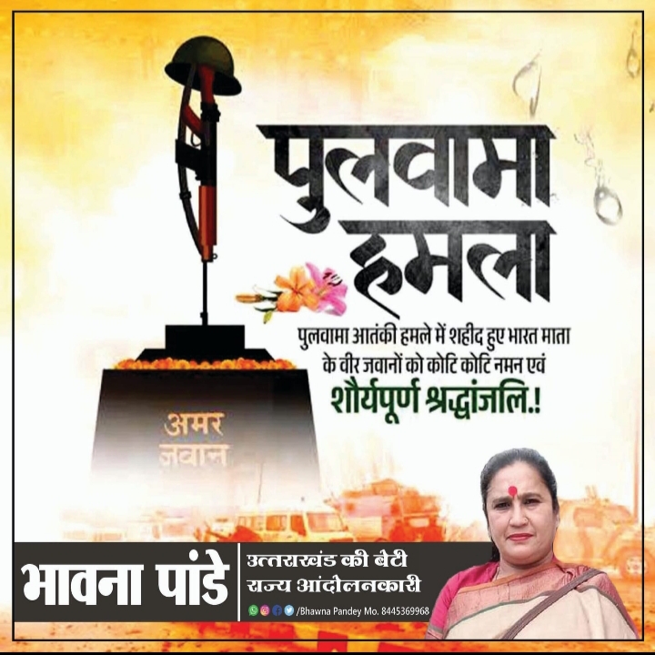 भावना पांडे ने कहा, वर्ष 2019 में पुलवामा में हुए आतंकी हमले की बरसी पर माँ भारती की रक्षा में अपना सर्वस्व न्योछावर करने वाले अमर बलिदानियों को कोटिशः नमन एवं विनम्र श्रद्धांजलि। साहस, शौर्य और समर्पण से ओत-प्रोत आपकी जीवन गाथा हम सभी देशवासियों के लिए सदैव प्रेरणास्रोत रहेगी।